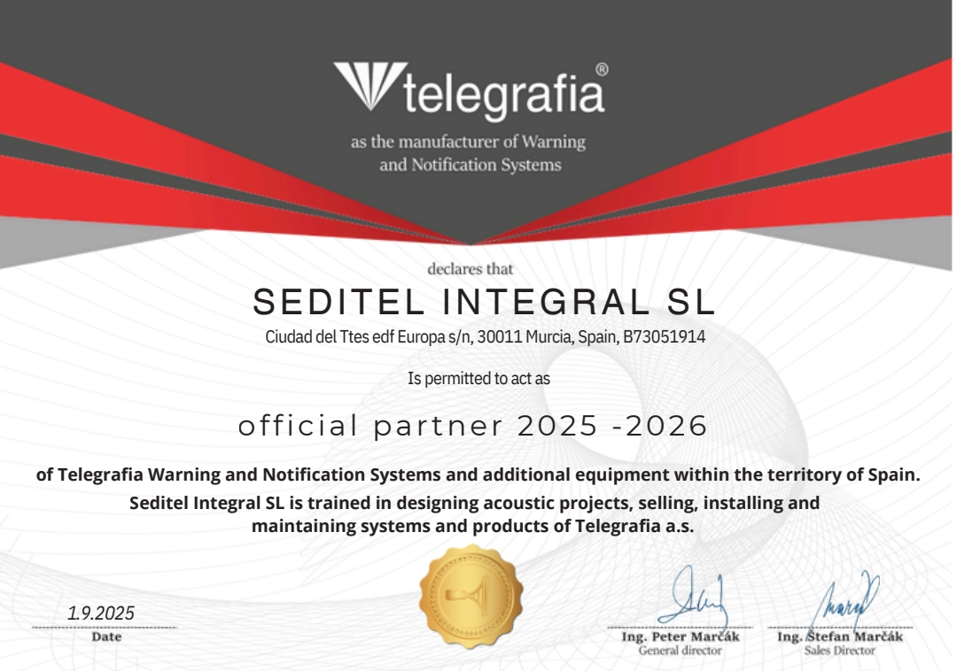 Seditel se convierte en Official Partner de Telegrafia a.s.. prestigioso fabricante de soluciones de sistema de alarma y notificaciones. Nuestra compañía ha superado el proceso de formación para el diseño, comercialización, instalación y mantenimiento de sistemas y productos de Telegrafia, líder en soluciones de alerta para ciudades, ante inundaciones, incendios, terremotos y todo tipo de incidencias.